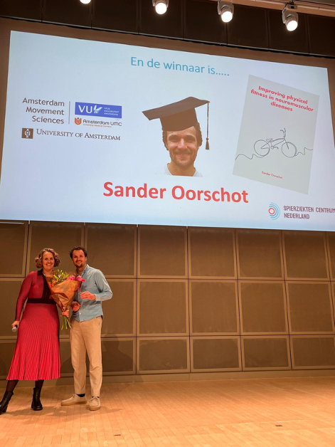 During the clinical symposium, Sander Oorschot received the NL‑NMD Thesis Award for the best clinical thesis for his work titled ‘Improving physical fitness in neuromuscular diseases’. The research in this thesis was embedded within the Amsterdam Movement Sciences Research Institute, at the department of Rehabilitation Medicine, Amsterdam UMC, location University of Amsterdam, the Netherlands. The thesis aimed to expand knowledge on improving physical fitness in people with NMD. Central was a high-quality, multicenter RCT evaluating the short- and long-term efficacy of the I’M FINE intervention on physical fitness, physical functioning, daily physical activity and quality of life in people with NMD, compared to usual care. The intervention proved safe and improved physical fitness by 10% directly post-intervention. Importantly, these results were achieved with a home-based program, whereas others used mainly hospital-based programs. Home-based programs are easier to implement into daily life and reduce travel demands and intensive therapist support. We warmly congratulate Sander on this award and hope he will continue to make a valuable impact for patients with neuromuscular disorders in the future!