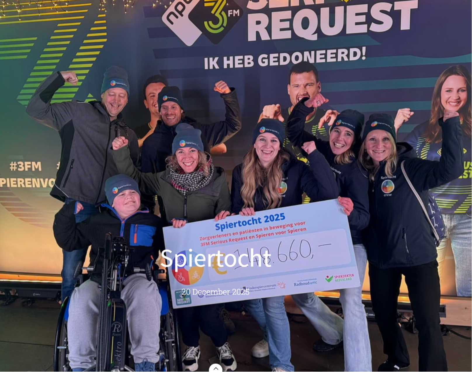 Spierziekten Zorgnetwerk Noord-Nederland also took part on 20 December 2025 in the national “Spiertocht” for 3FM Serious Request. With a team from Revalidatie Friesland, Treant, the Center for Rehabilitation at UMCG, and the multidisciplinary neuromuscular team at UMCG, we joined forces to raise an amazing amount for Spieren voor Spieren together with all participants nationwide in the Spiertocht! A great example of how a Neuromuscular Care Network can work together and become stronger as one.